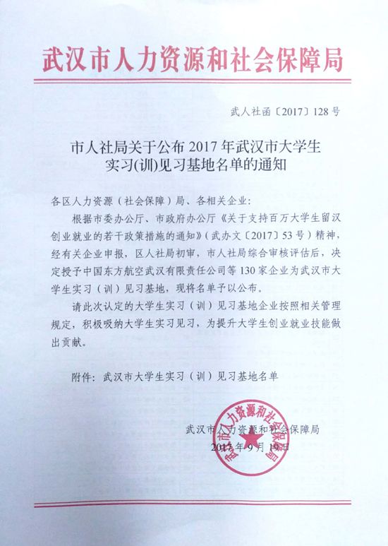 為大力實(shí)施“百萬(wàn)大學(xué)生留漢創(chuàng )業(yè)就業(yè)計劃”,貫徹落實(shí)武漢市委辦公廳、市政府辦公廳《關(guān)于支持百萬(wàn)大學(xué)生留漢創(chuàng )業(yè)就業(yè)的若干政策措施》文件精神,武漢市人力資源和社會(huì )保障局組織專(zhuān)班通過(guò)實(shí)地走訪(fǎng)的形式對企業(yè)進(jìn)行考察和評估,經(jīng)多輪遴選,我司被確認為2017年武漢市大學(xué)生實(shí)習(訓)見(jiàn)習基地。