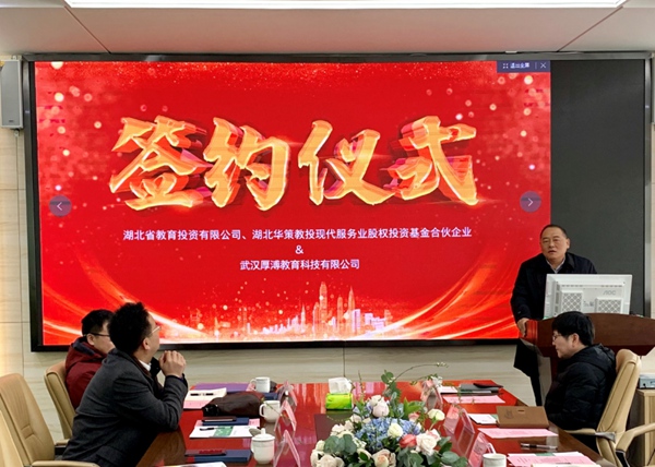 湖北省教育投資有限公司董事長(cháng)左飛、湖北教投創(chuàng )智股權投資基金管理公司董事長(cháng)閆方義、武漢厚溥教育科技有限公司董事長(cháng)陳相陽(yáng)等領(lǐng)導出席本次簽約儀式并致辭。