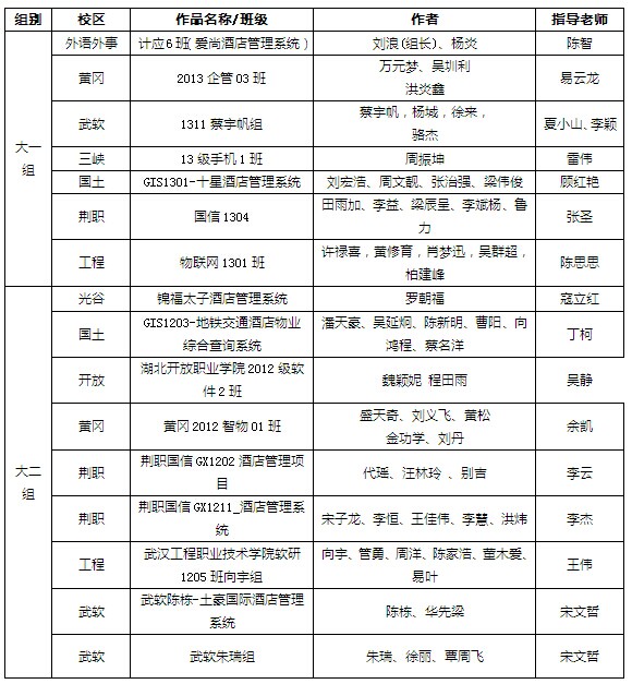 荊州職業(yè)技術(shù)學(xué)院國際信息技術(shù)學(xué)院宋子龍、李恒、王佳偉、李慧、洪煒五位同學(xué)的作品獲得大二組一等獎、黃岡職業(yè)技術(shù)學(xué)院國際軟件學(xué)院盛天奇、劉義飛、黃松、金功學(xué)、劉丹五位同學(xué)獲得大二組二等獎、湖北開(kāi)放職業(yè)學(xué)院軟件與服務(wù)外包學(xué)院魏穎妮、程田雨兩位同學(xué)的作品獲得大二組三等獎、武漢工程職業(yè)技術(shù)學(xué)院厚溥軟件學(xué)院向宇、管勇、周洋、陳家浩、董木愛(ài)、易葉六位同學(xué)的作品獲得大二組三等獎、荊州職業(yè)技術(shù)學(xué)院國際信息技術(shù)學(xué)院代瑤、汪林玲 、別吉三位同學(xué)的作品獲得大二組三等獎。