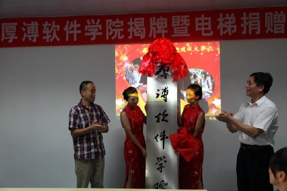 在熱烈的掌聲和歡快的音樂(lè )聲中,校黨委書(shū)記韓德鋒、武漢厚溥教育科技有限公司董事長(cháng)陳相陽(yáng)共同為“厚溥軟件學(xué)院”揭牌。隨后舉行了電梯捐贈儀式。