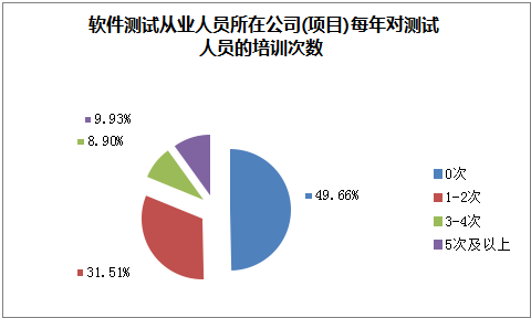 然而,在被調查者所在公司中,測試人員與開(kāi)發(fā)人員的比例在1:4及以上的高達55.13%。在這些公司中,49.66%的公司每年對測試人員進(jìn)行的培訓次數為0。也就是說(shuō),將近一半的軟件測試人員在工作后沒(méi)有進(jìn)行培訓學(xué)習的機會(huì ),這就要求想從事軟件測試的人員在入職前培訓相關(guān)的技能,確保工作可以順利開(kāi)展。